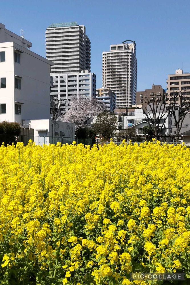 ここの景色、私も大好きなんです。ここ数年毎年、菜の花畑になり、今年は綺麗に桜とのコラボでした。都会の中のオアシスです💛🌿💛🌿💛🌿(田舎みたいな市ですが😅✌️)