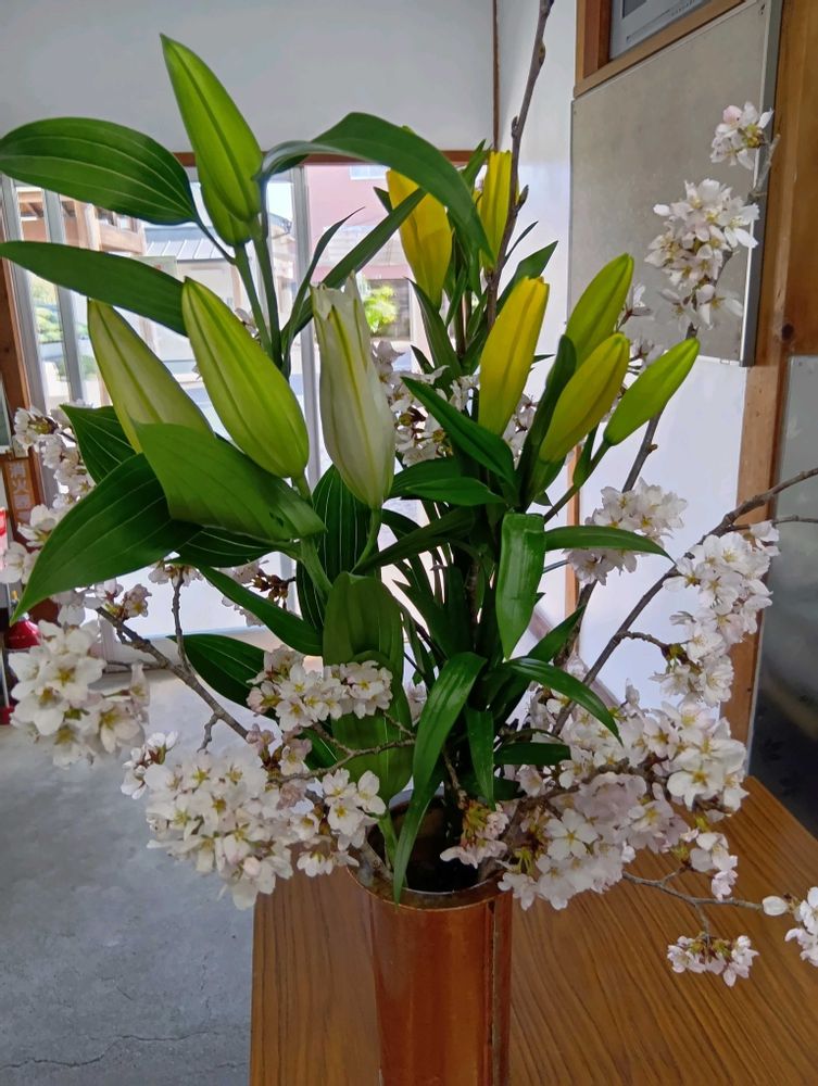 桜の枝を゙頂いたのでユリと生けてみました、、頂いた時には蕾も有ったのですが生けると直ぐに満開です🌸😊🤗