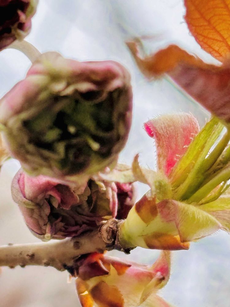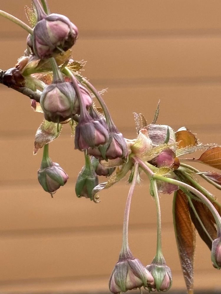 この八重桜も、少し色味が変わっていて、蕾はダークな朱色?グレー?