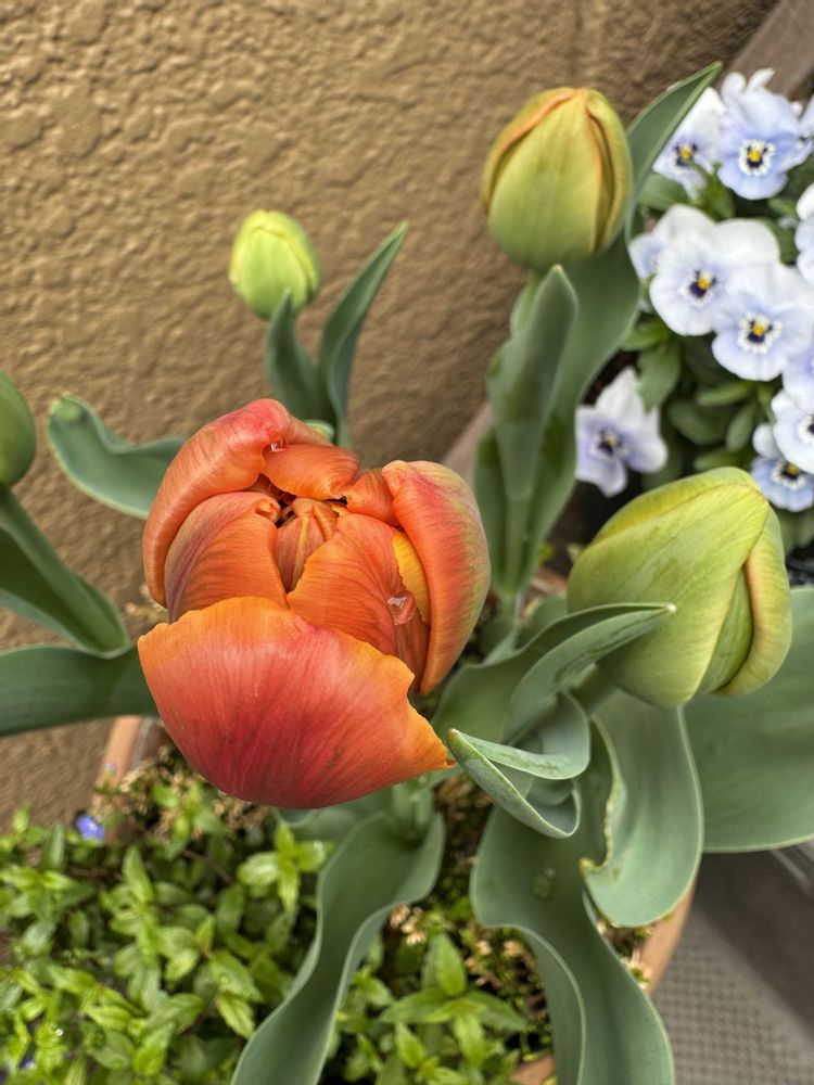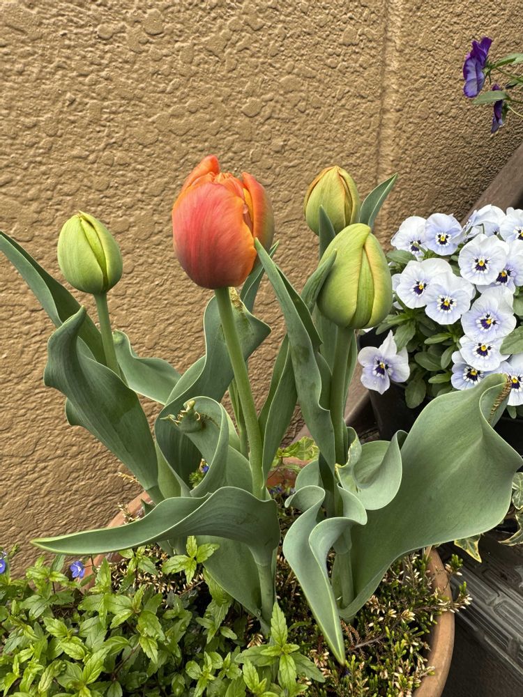 12月に球根を寄せ植えの鉢に忍ばせておいた チューリップ