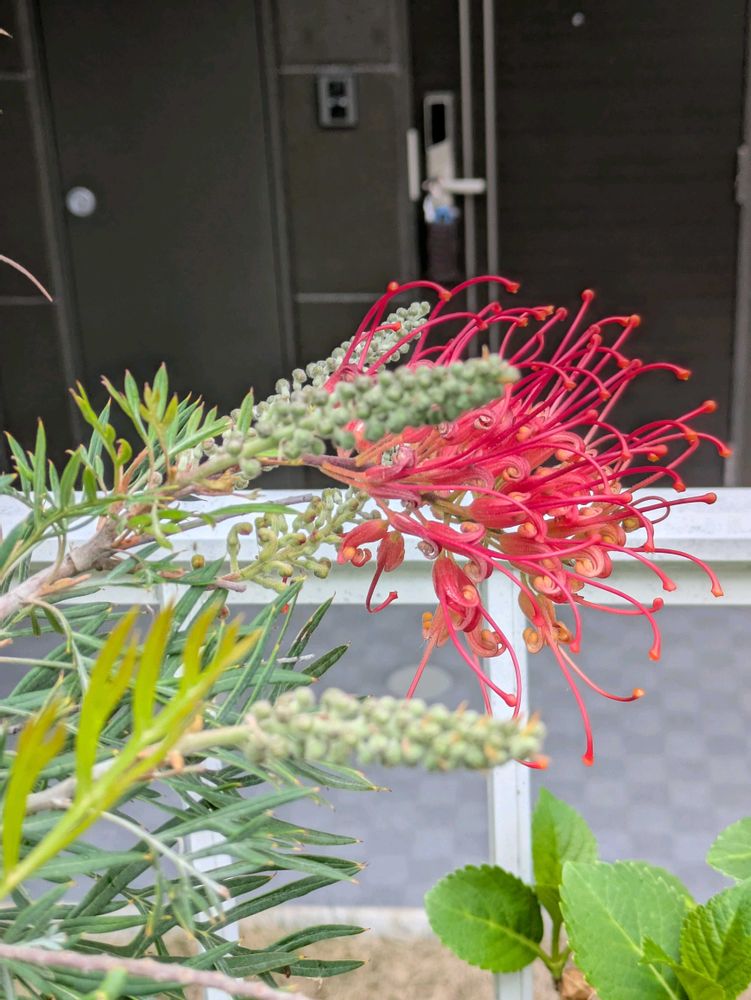 グレビレア ロビンゴードン 何と夏より赤く咲いています。