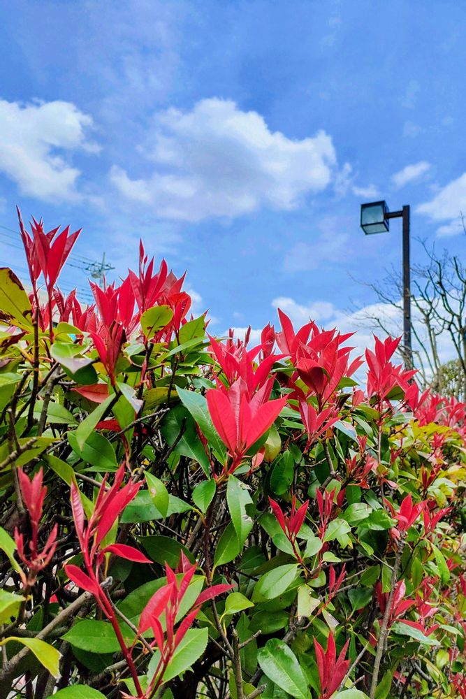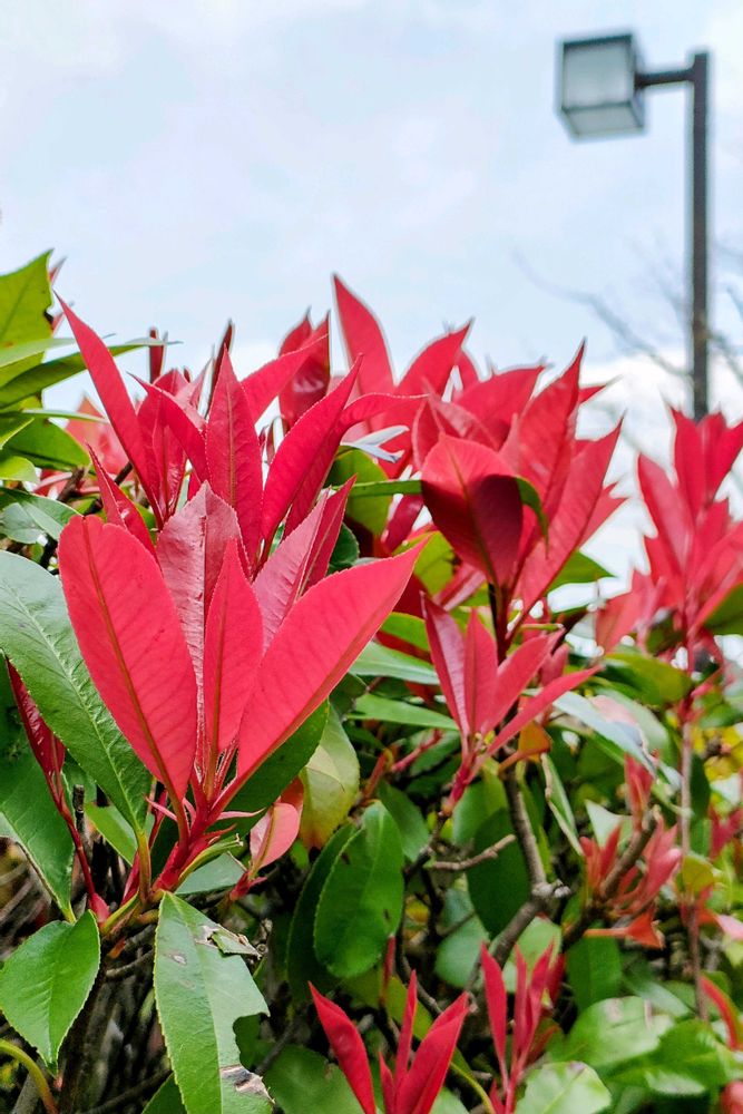アチコチの生け垣のベニカナメモチ(レッドロビン?)の新芽が真っ赤です。