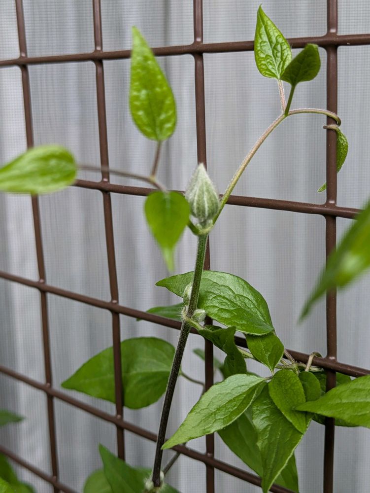 元々、つるがあんまり伸びないけど、地際から15センチくらいからつぼみがついたり、40センチくらいつるが伸びててっぺんと側枝につぼみがついたりしてますね。