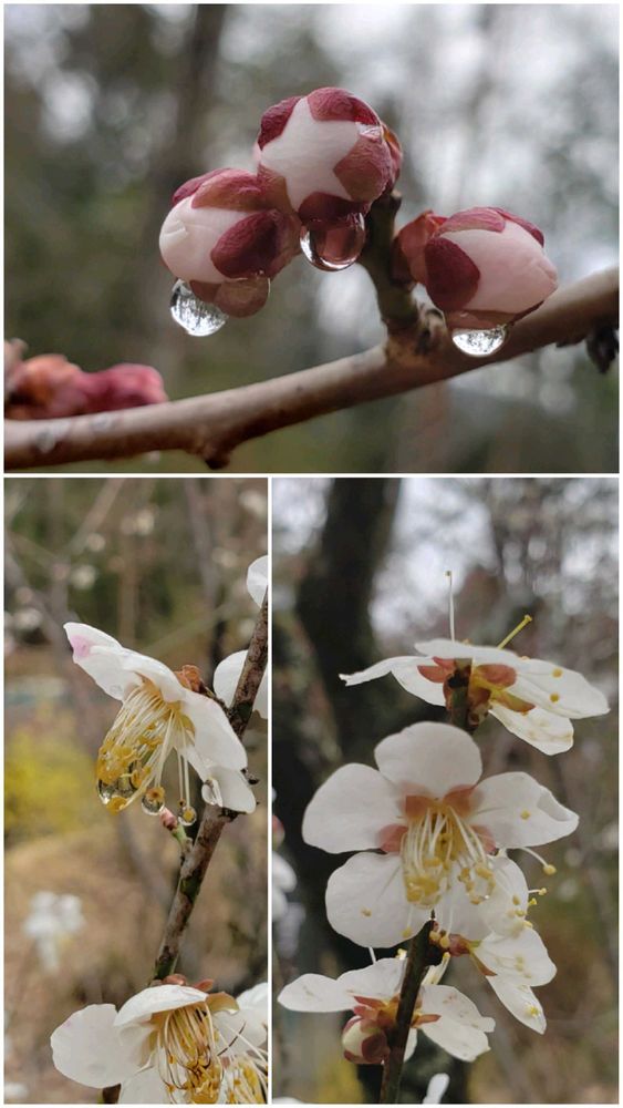 雫を湛えた紅白梅の紅梅は開花待ち。