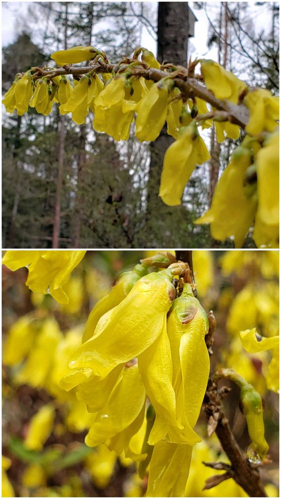 レンギョウは雨に濡れて尚伸びやか。