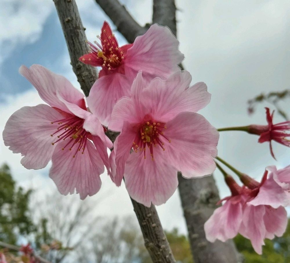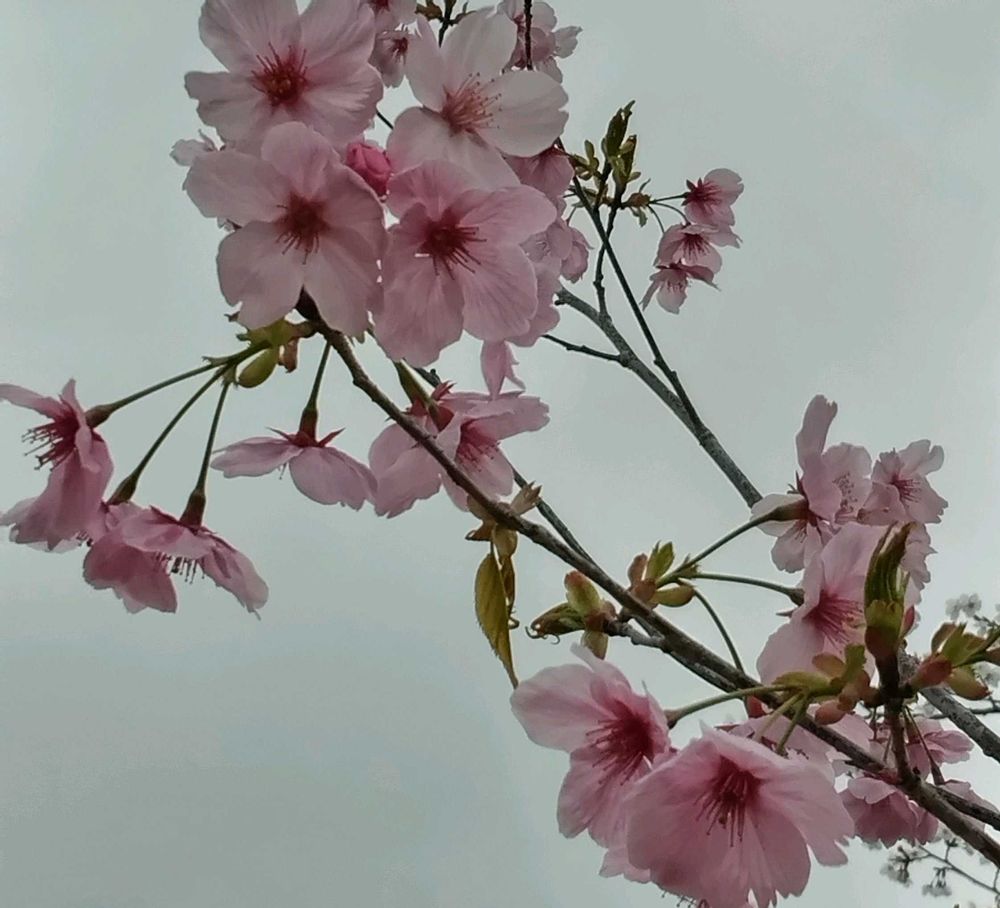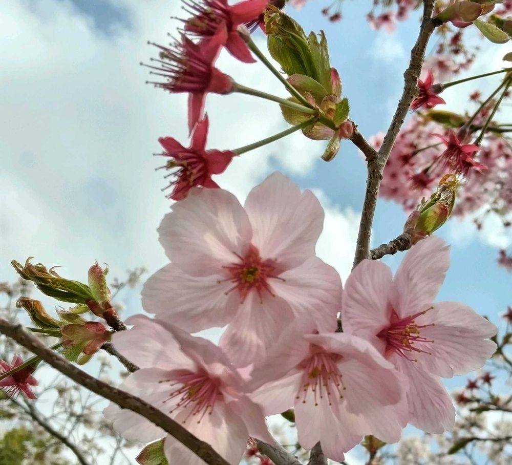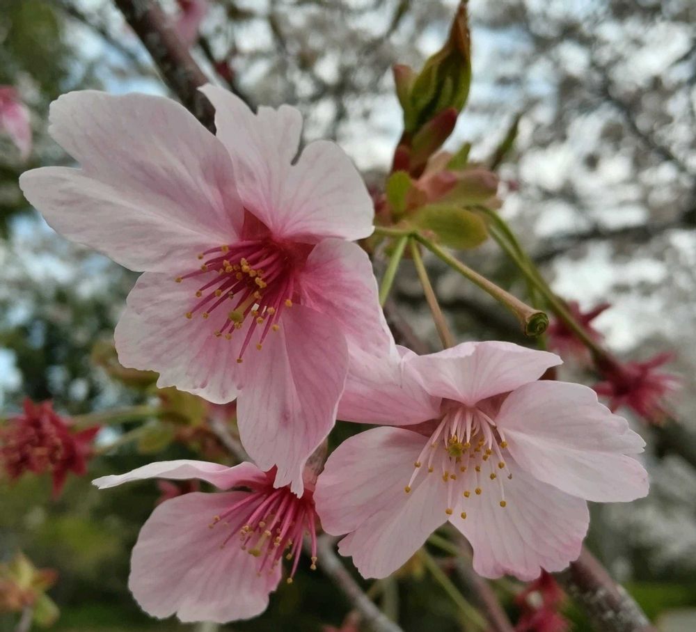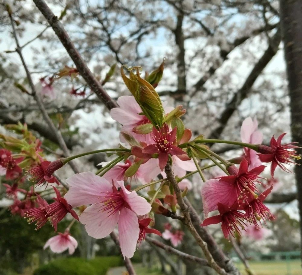 以前からあるソメイヨシノの大きな木の横で濃いピンクの花を咲かせています💞
