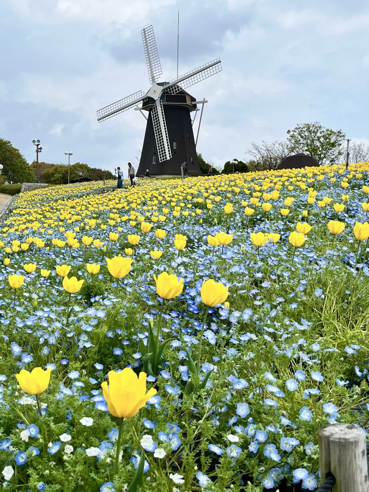 こんにちは✨ 今日🎵大阪の花博記念公園鶴見緑地に行ってきました😊 風車の丘大花壇のチューリップとネモフィラが、見頃で💕とても綺麗でした😄 桜も満開で綺麗でした✨