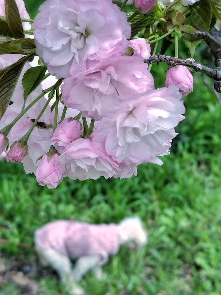 毬の様な八重桜の下をお散歩するワンちゃん🐶