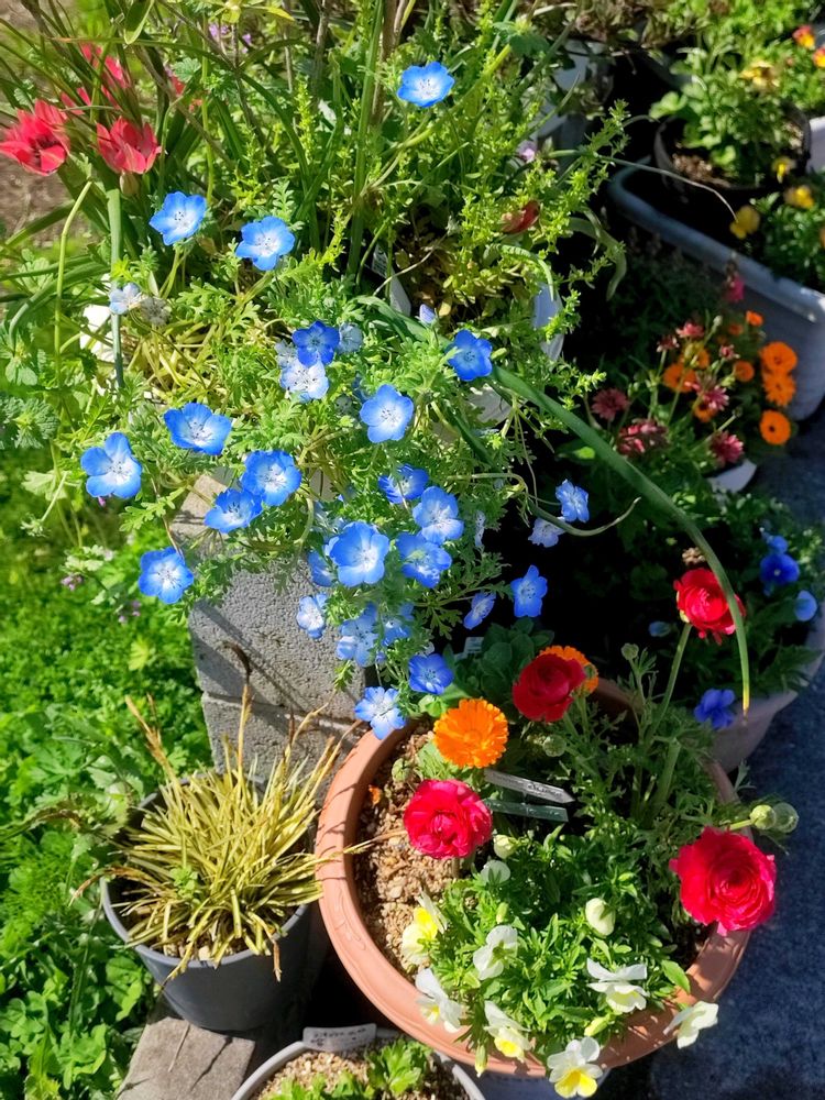 天気が良くて暑いです。本日の花。種からのネモフィラがもりもりです。ネモフィラあんま興味なかったんですが、小花&水色なのにパッと目を引きますね。不思議~。人気なの納得です。ポット苗は発芽後の管理がなかなか難しかったので、来年は浅めのプランターにすじ撒きでやってみようと思います。暖かくなるまで沈黙を保ってたのに、暖かくなったら一気に大きくなって、なかなか調子がつかみづらい植物ですが、来年はもっとたくさん咲かせたい…