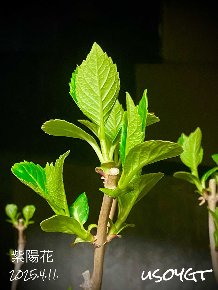 我が家の小さなお庭…闇夜に映える「紫陽花」の葉芽です🤗