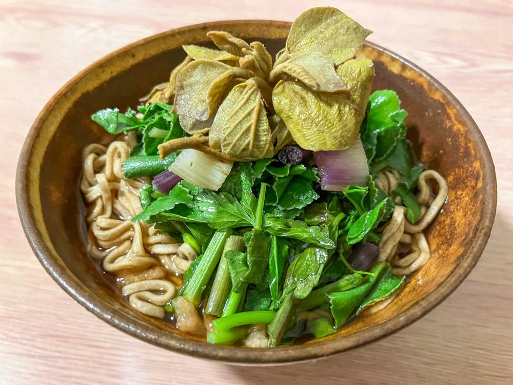 香りは抜群なので氣の巡りのサポートを得意としている香りグリーン野草さんたちとお蕎麦のトッピングに