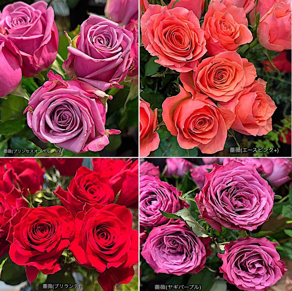 紫系x2、ピンク系x1、赤x系のバラ、4つ
