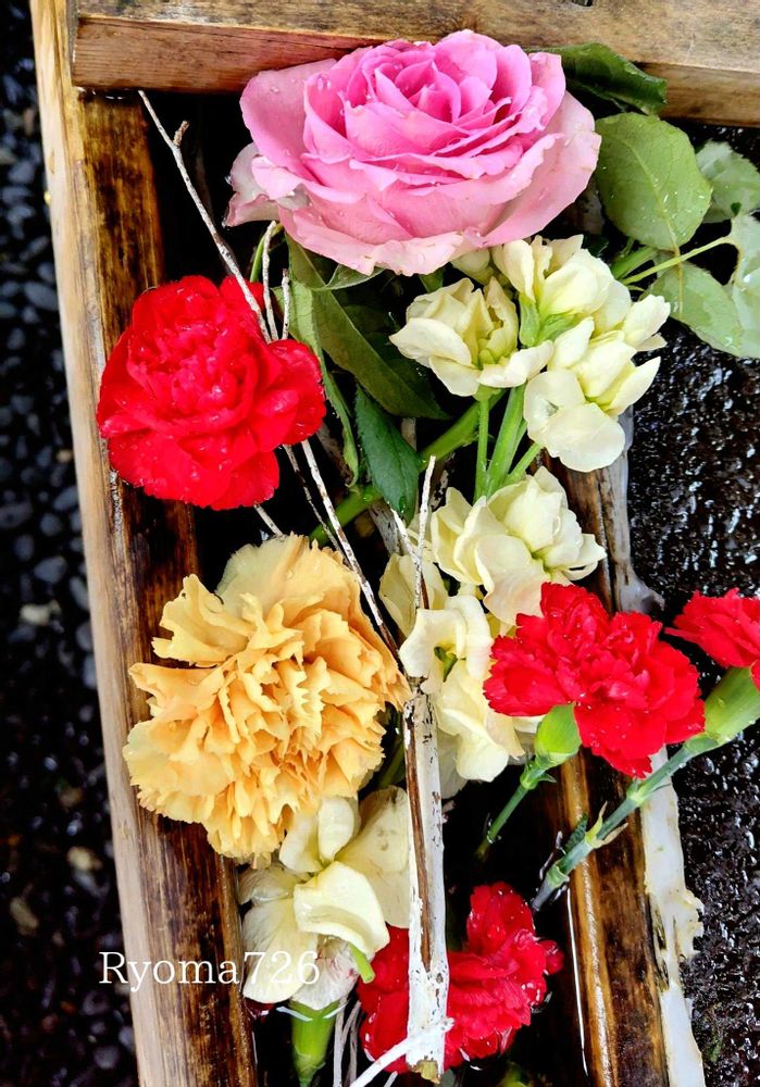 ①②カーネーションの入った 神社の花手水がきれいでした😀