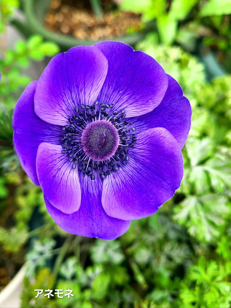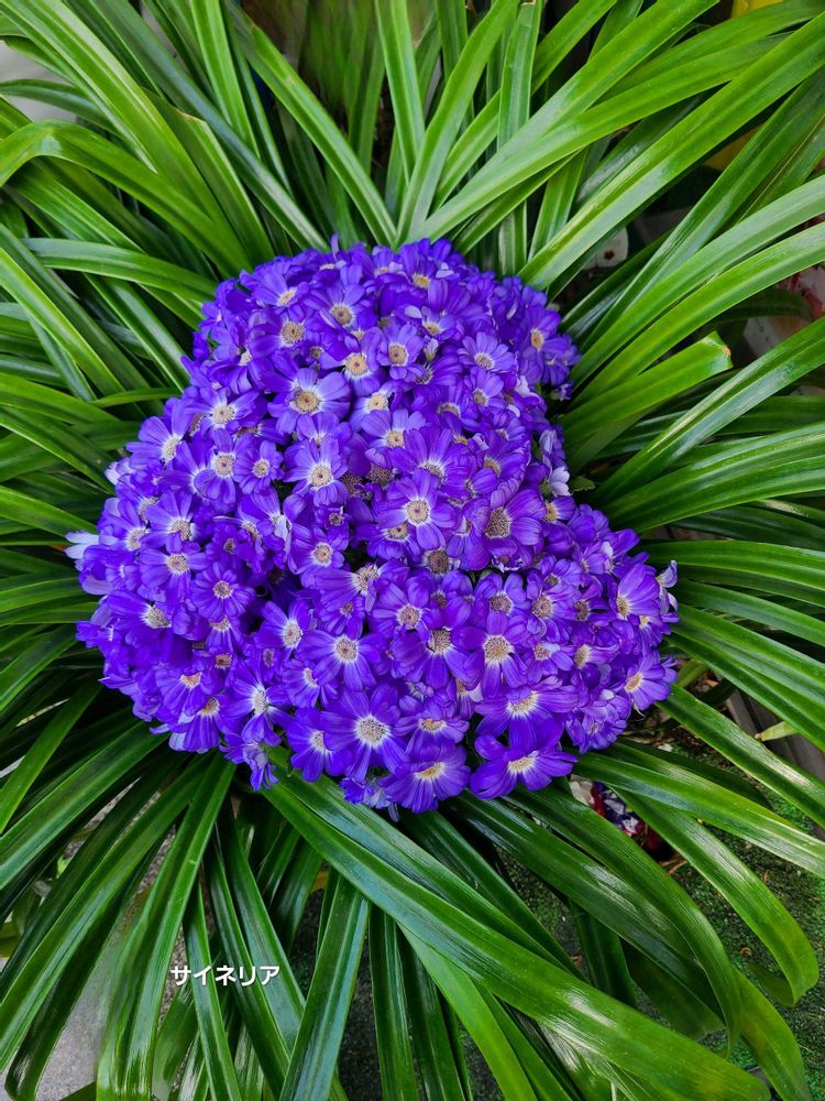 目の覚めるような青い(写真は紫色?)サイネリア、え?この葉っぱはサイネリア?じゃあないよね。何の葉でしょうか?