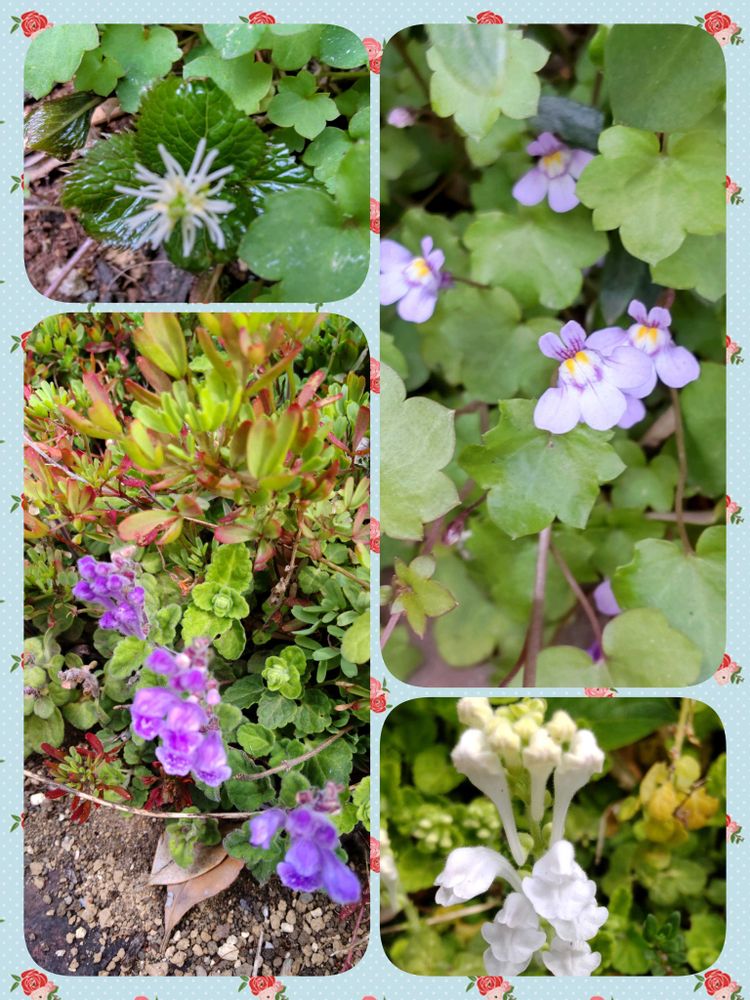 【ヒトリシズカ、ツタバウンラン、白と紫のタツナミソウ】。