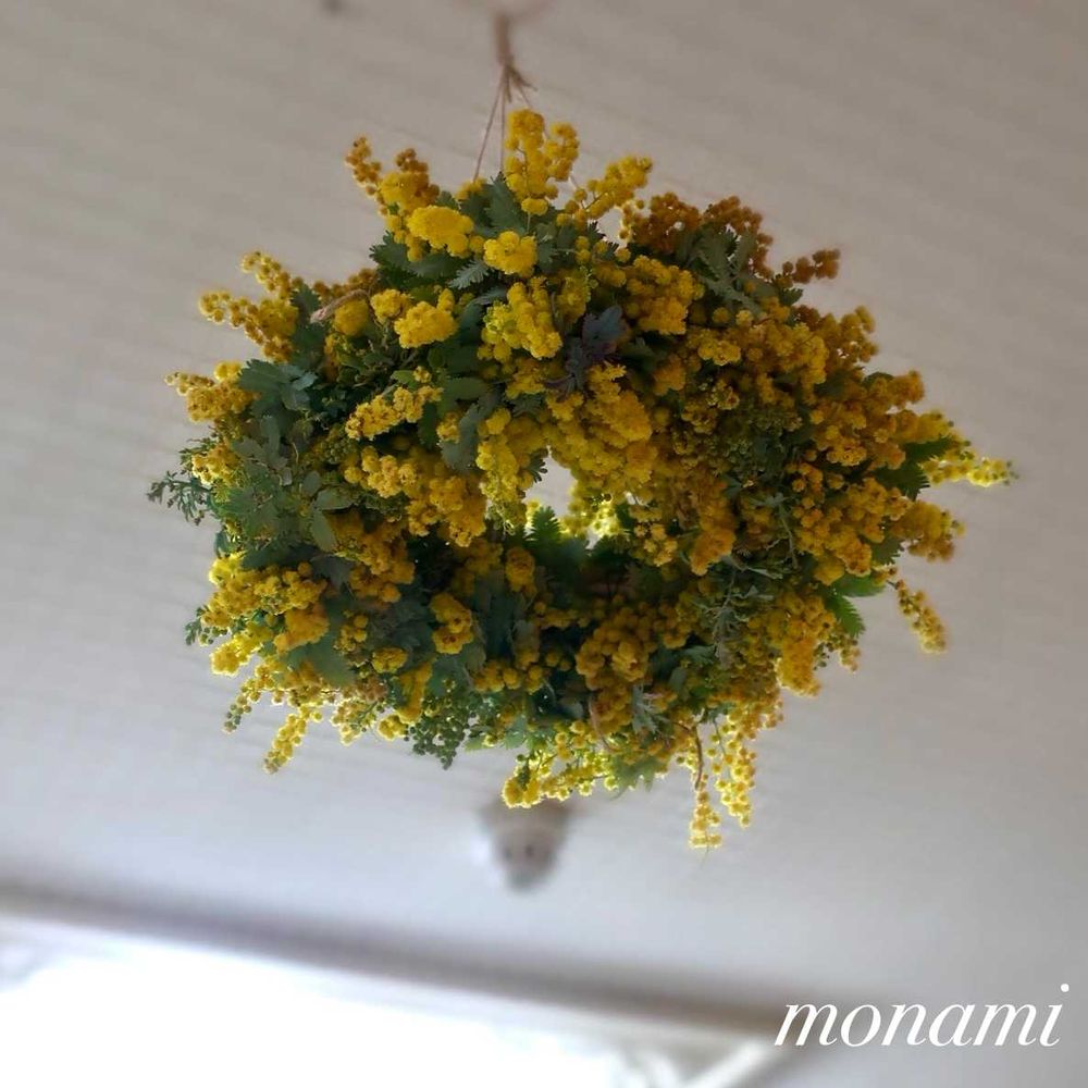 ミモザはお花があちこち向いてるから、リースよりもフライングリスリースが向いているかも👍
