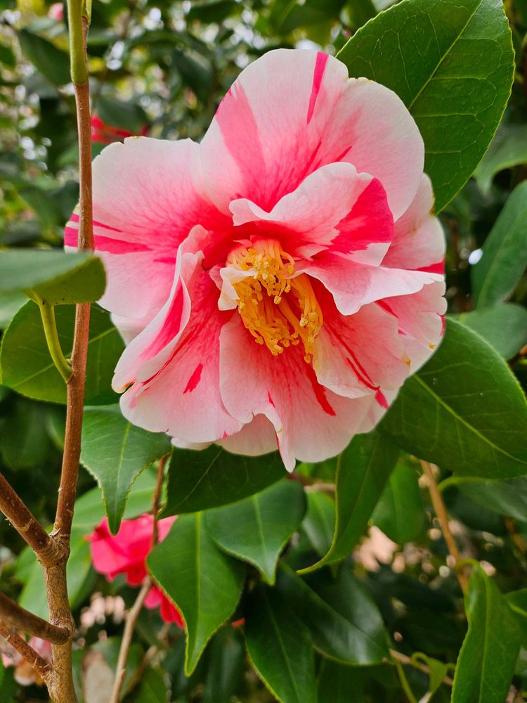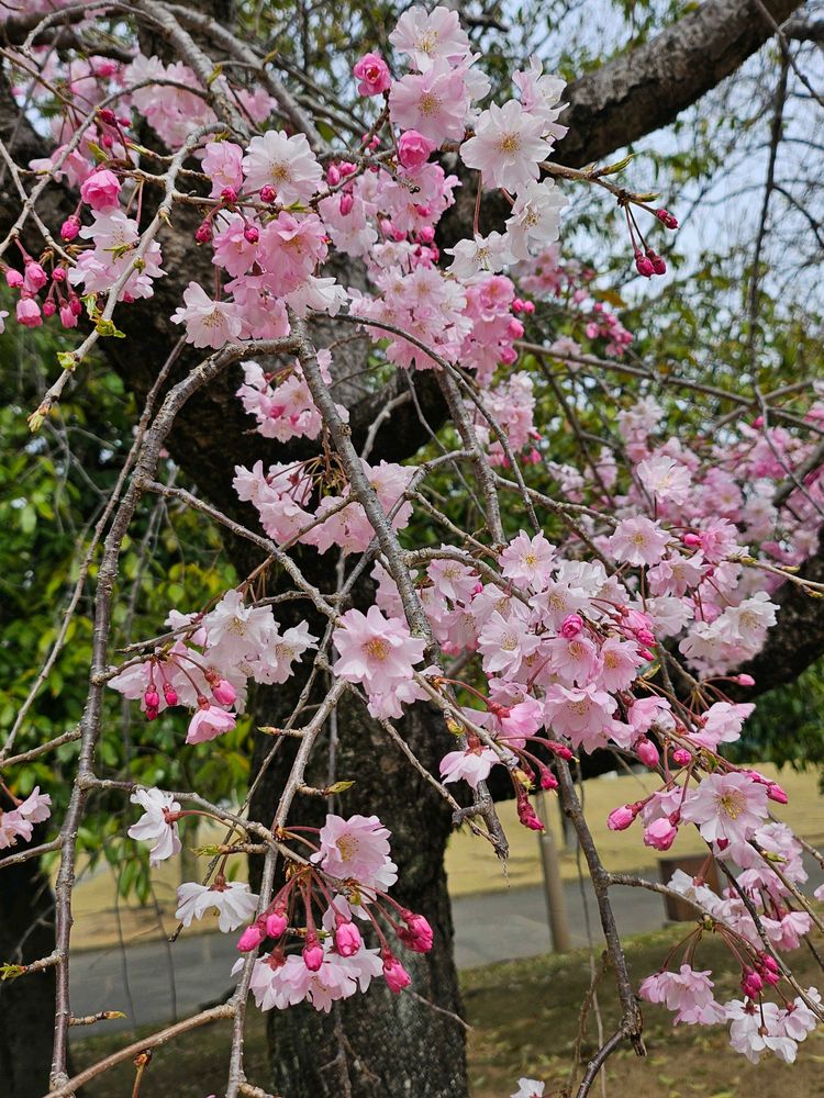 おはようございます。シロトピア記念公園の枝垂れ桜と美術館通りのつばきです🌺
