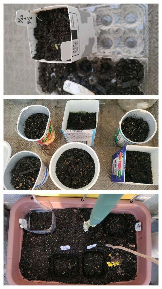 上:4/6、ミニトマト発芽。卵パックから牛乳パックへ移す。