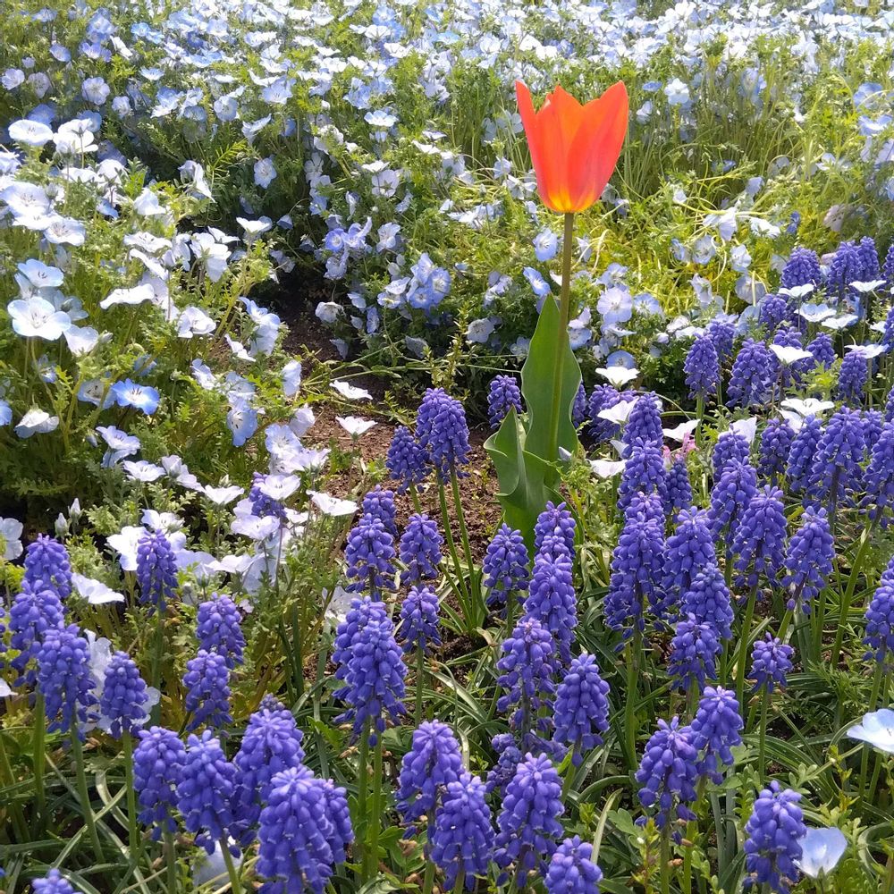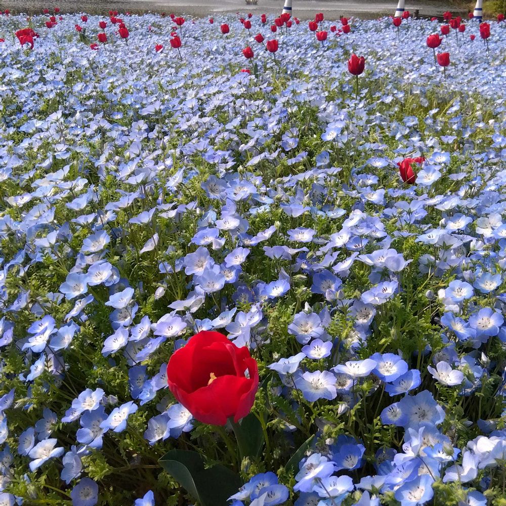 ネモフィラの群生に真っ赤なチューリップ🌷、ステキですね💕