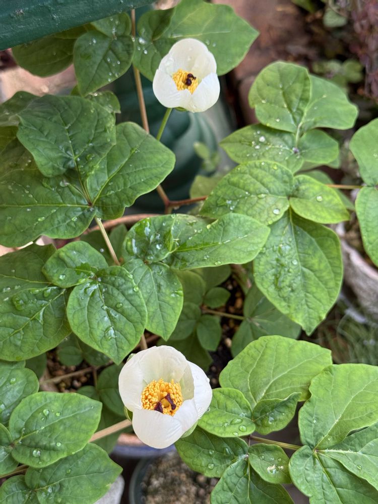 全部に芽が出て今年咲くまで、猛暑を越せなかったりうどん粉病になったり根を虫に食べられたり、色々あり3株に。その3株の内の1株に今年2つ花が咲きました。