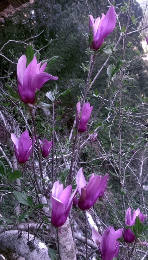 📝この花は宮崎県宮崎市田野町側の、鰐塚山の麓に在る、従兄弟の山小屋別荘の敷地の物置小屋の傍に植栽されている紫木蓮の花の形状が色々あり、違っているのが面白くて撮ったものデス🐶