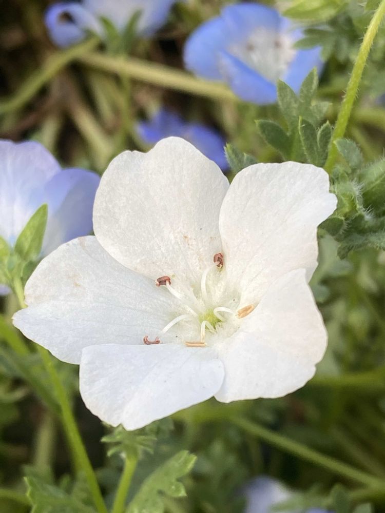 ネモフィラの鉢値引きでラベルは💙色蕾がついていたので買ってき、今日咲いたら🤍花でした💦