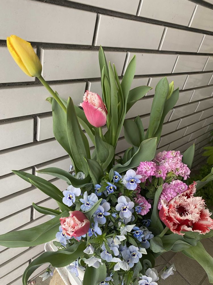 玄関アプローチ,お花に癒されて❤️,寄せ植えのチューリップの投稿画像