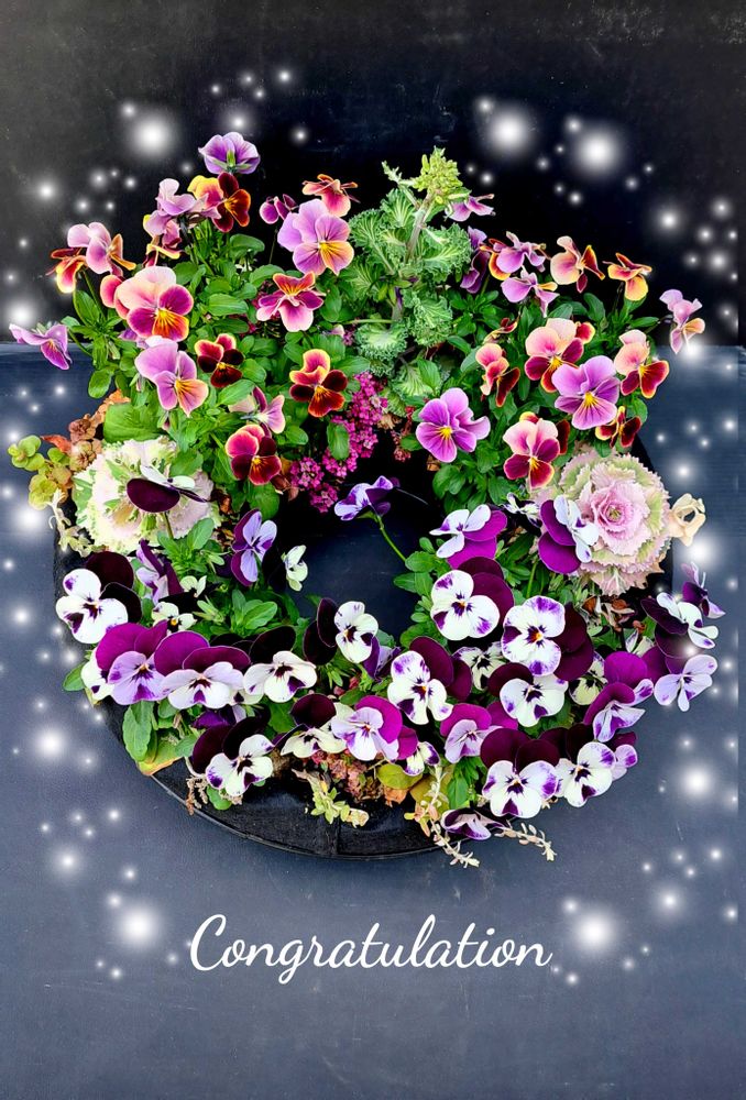 ①枚目…見事にモリモリになった、ビオラメインのリースでお祝いさせて貰いますね~😂💖
