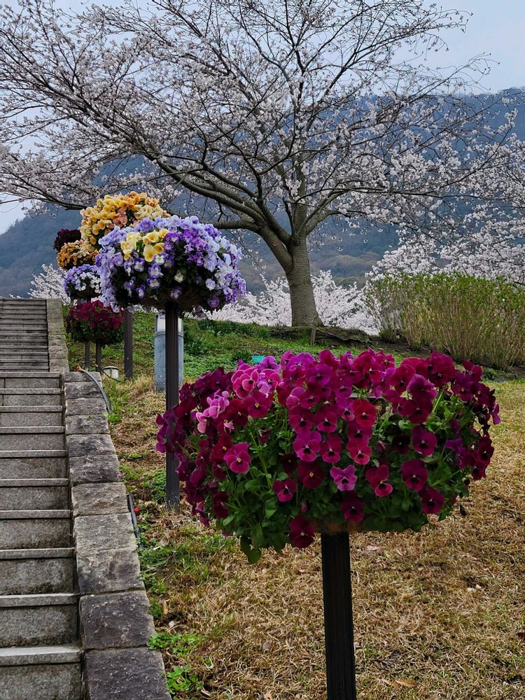 正面アプローチ階段のハンギングが桜とマッチしておしゃれで素敵でした。