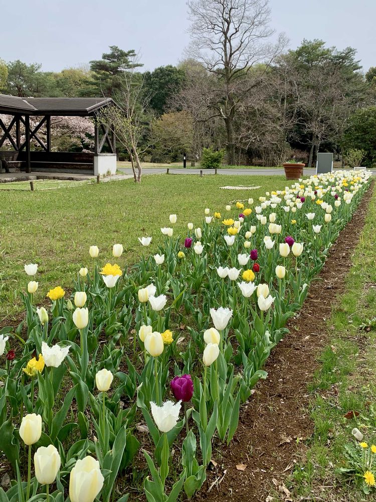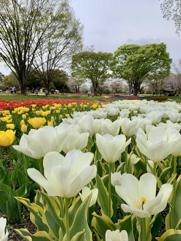 3枚目のチューリップの川がお気に入り⭐️白いチューリップに混ざってところどころ色の違う花が咲いているのが印象的🤍💜🤍💛