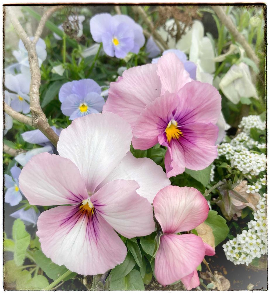 🩵は忘れな草?に見えるって事かな🤔一応ビオラだよと言っておこうかな。🩷がパンジーだよ〜✩⡱