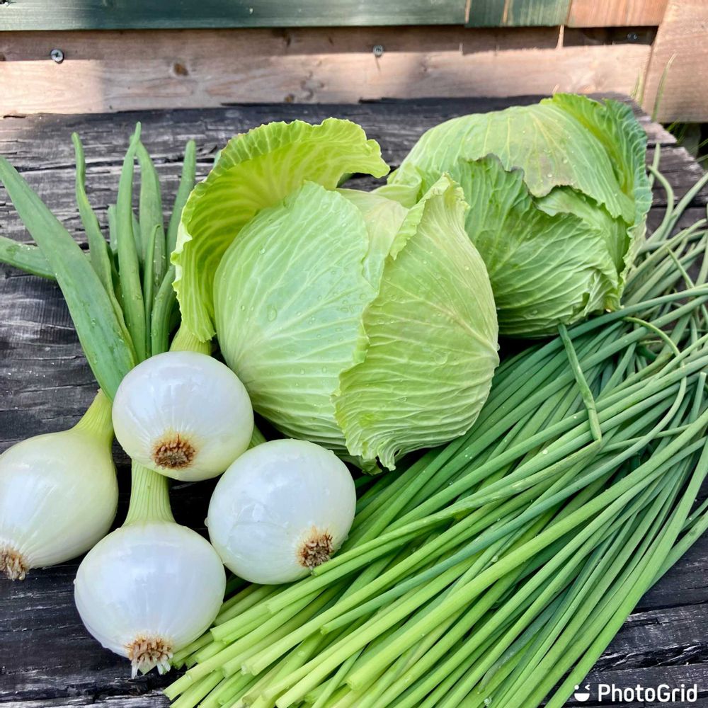 野菜畑の恵みは、キャベツと玉ねぎ🧅とアサツキ😊。