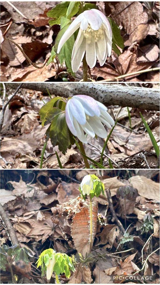 ⬇️は出てきたばかりのアズマイチゲ、茎の長毛が目立ちます。キクザキイチゲも茎に長毛がありますけど、アズマイチゲの毛は触るとすぐに脱落しますけど、キクザキイチゲはそんなことはないですね🤔