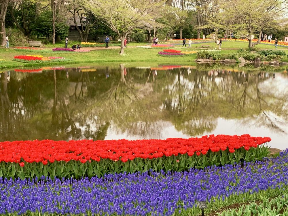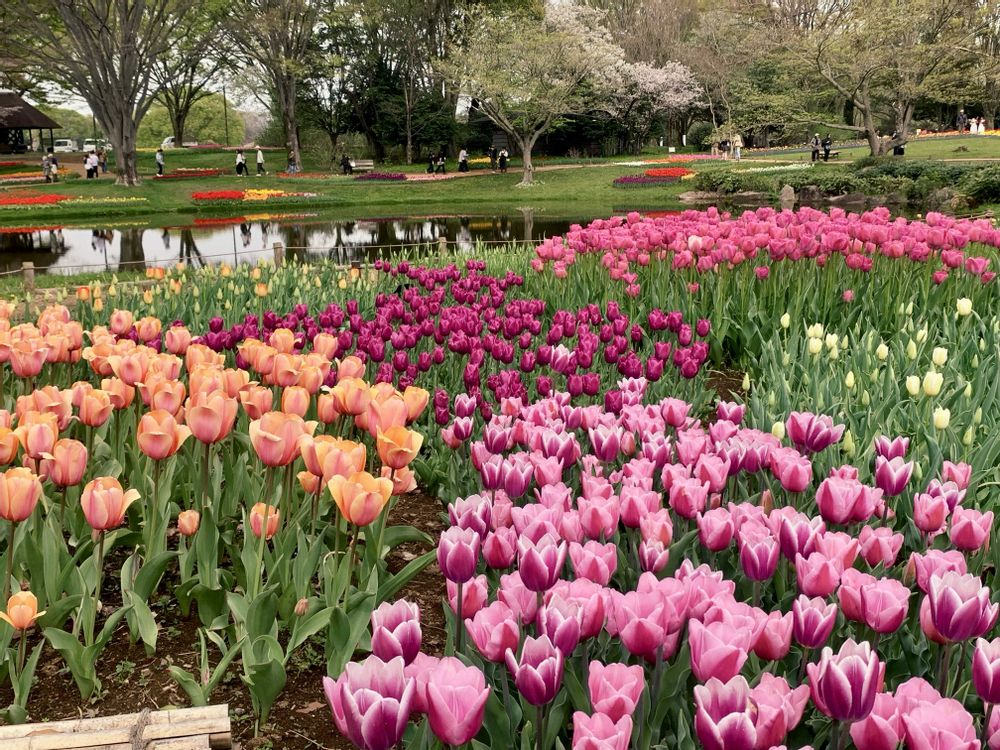横画面で撮ってみました!池とチューリップが映えますね🙌