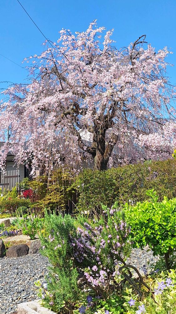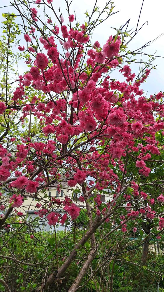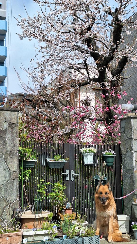 ①少し前の我が家の記念写真。1日遅刻の🏷️ワンワン祭りにロイ🐕️とソメイヨシノ🌸花桃で参加させて下さい。②大好きなヒナソウ2色。飛んで来た種から白いスミレも参加してます。 ③花桃は咲き進み今はこんなに濃くなりました。④ハイビスカス🌺もう開きました⑤ロイ🐕️の散歩コースの知人宅の枝垂れ桜も見事👏です