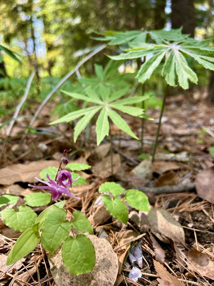 午前中は晴れて🔆。°お散歩日和でした。🚌💨と🚃を乗り継いで東京都薬用植物園を訪問。東大和市駅隣接の便利さなのに訪れる人はまばらな👼天国です。林地区にイカリソウ群落。ヤブレガサを従えてる子発見(☆∀☆)です小人の国に来たみたい🥰