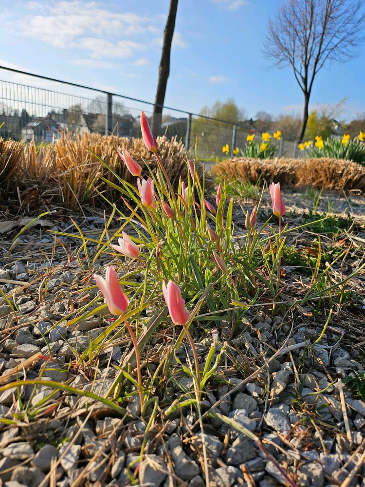 湖畔の花壇で見つけた、原種系ミニチューリップとラッパ水仙😍