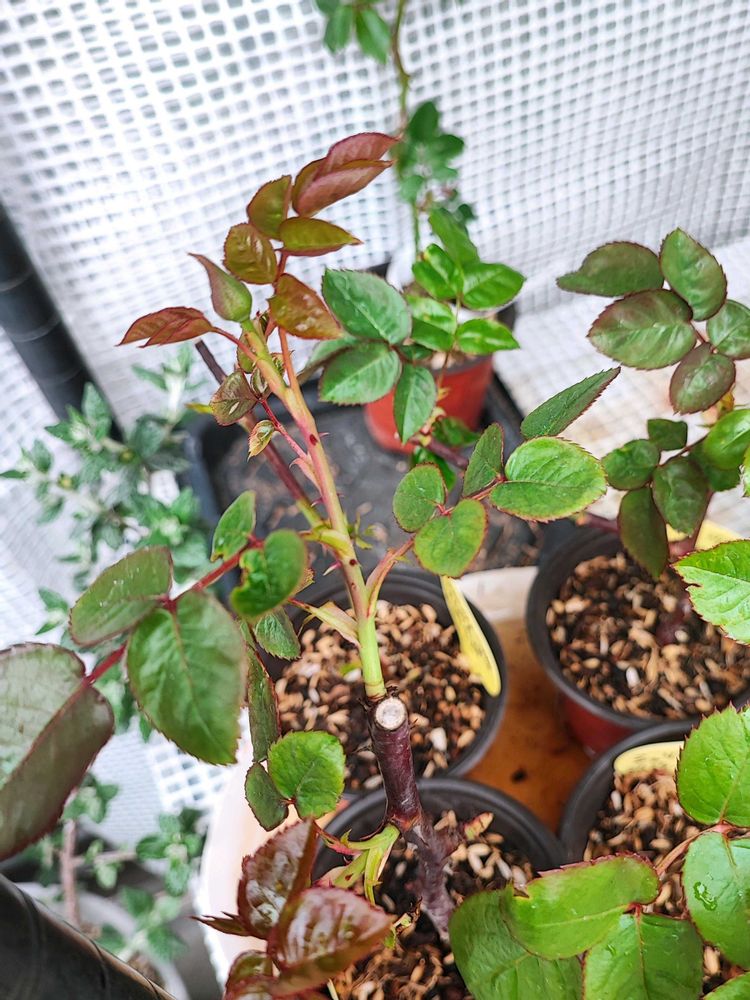 冬、1月とか?に剪定枝を使って休眠挿しし、先月ぶっとい白根が出てたのでポット上げしたバラ(シュラブ)、まさかの蕾がついてました...