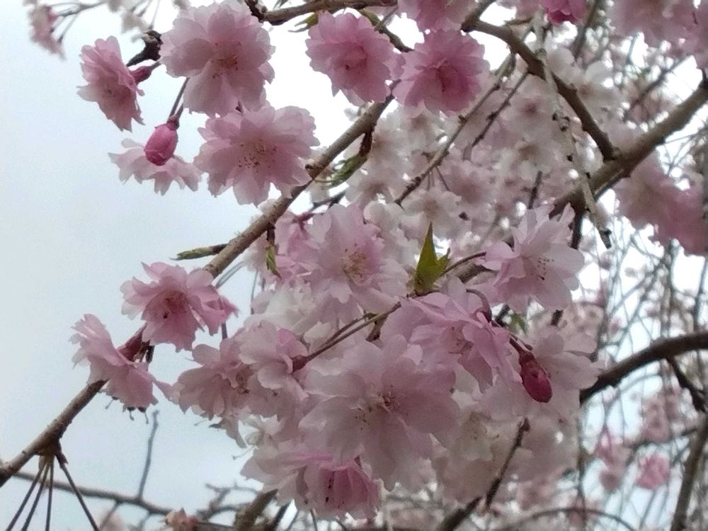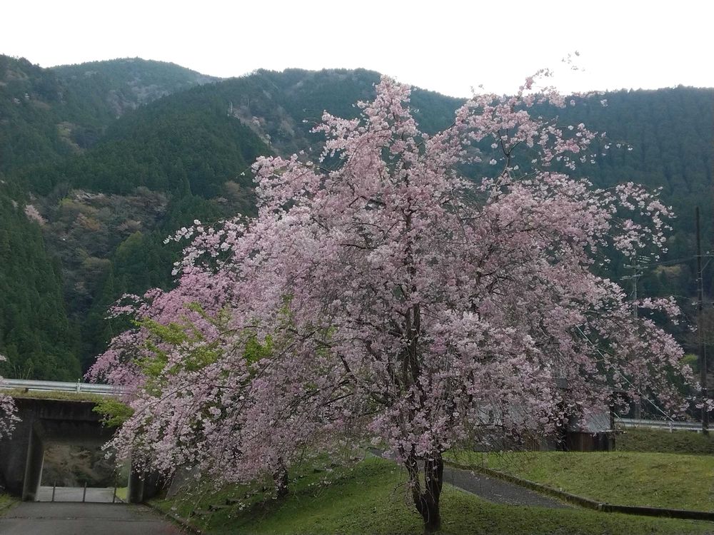 休憩場所では枝垂れ桜が咲いていてちょうど見頃。期せずしてお花見です。山の斜面の近くにあるそれなり有名観光地。遠すぎでよく分からん!