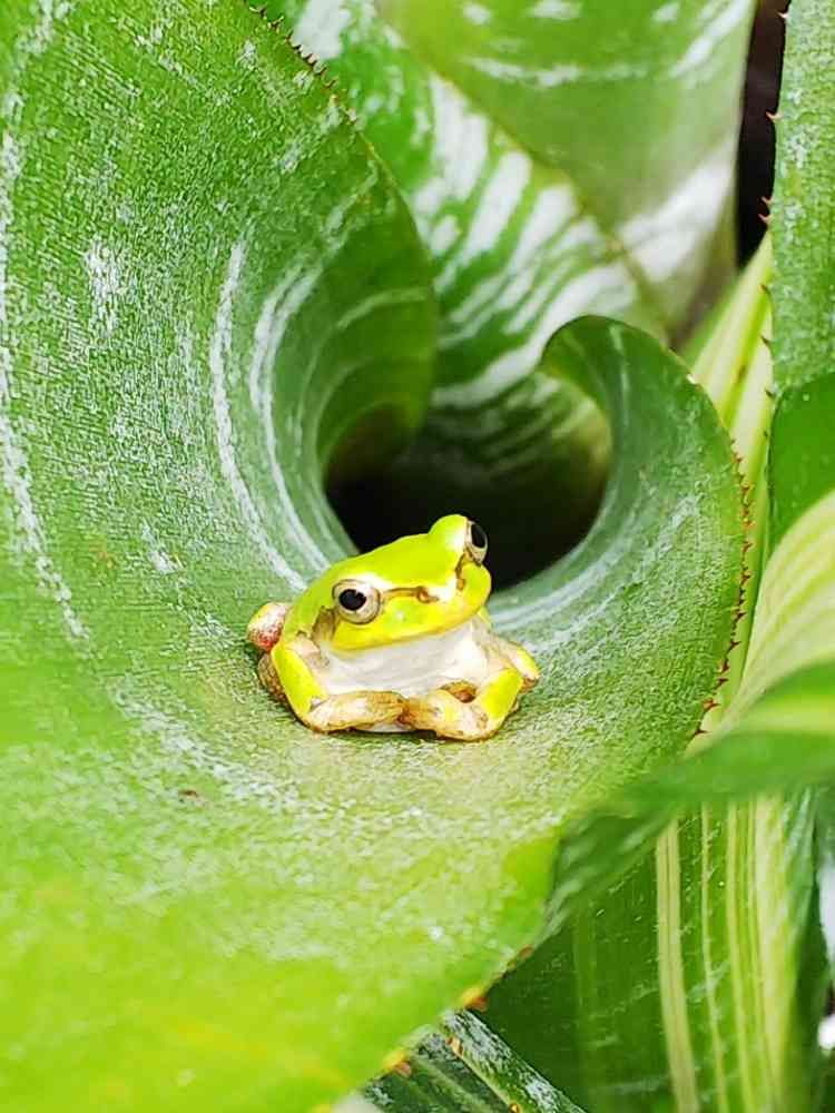 可愛いのであんまりしつこく撮っていたらこのあと葉っぱの隙間に逃げられましたよ🐸
