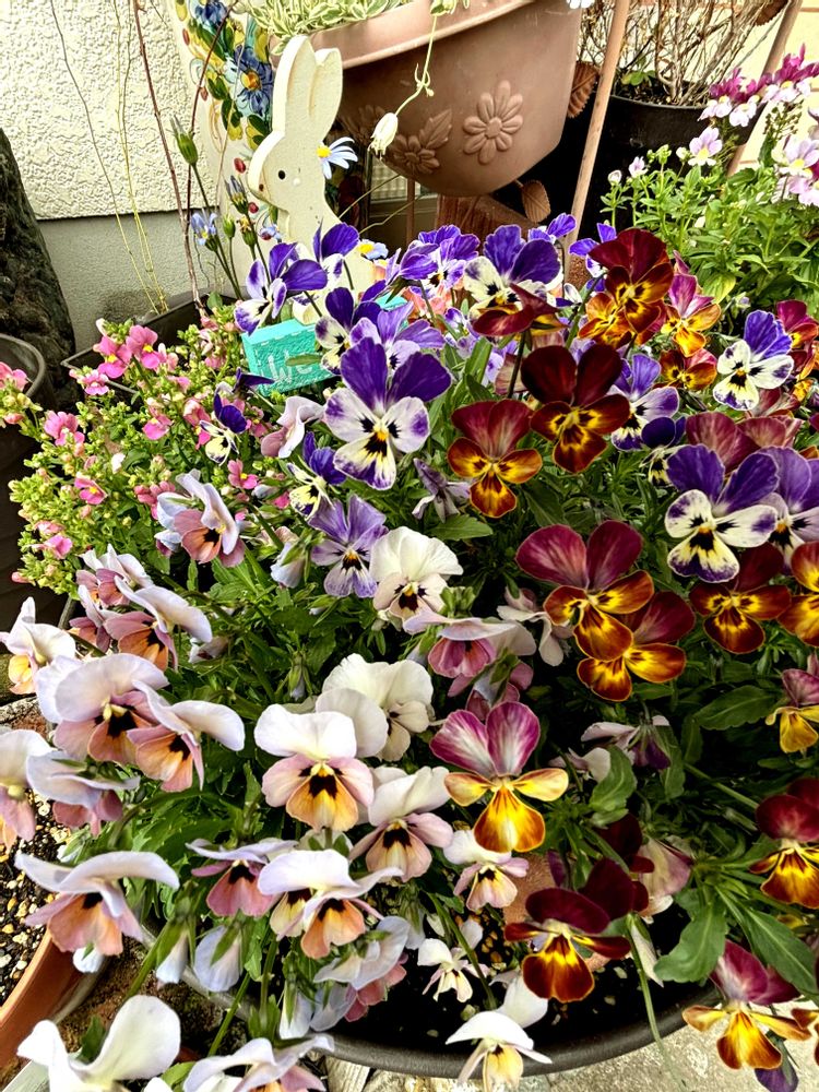 ビオラ2種💜🧡パンジー1苗🩷がひしめき合って咲いています。
