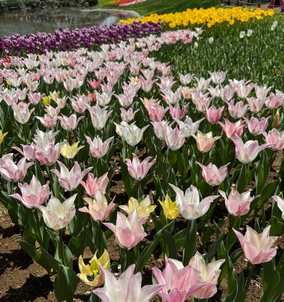 11時ごろ到着で日も高くなってきてパッカーンと開いた子たちも多かったですがチューリップが植えられた「渓流広場」では7割くらいが咲き揃って見ごろ。