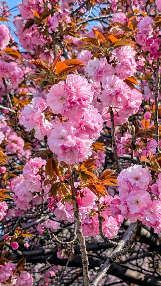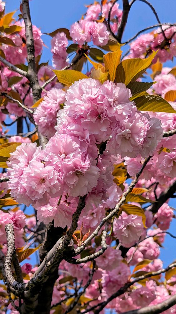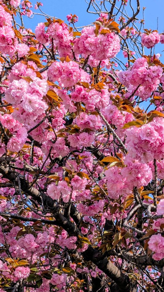 ソメイヨシノは華やかななかにもどこかはかなげです(と私は感じます☺️)がこの桜を始め八重系や大島桜には力強さを感じます。見ると元気になります。