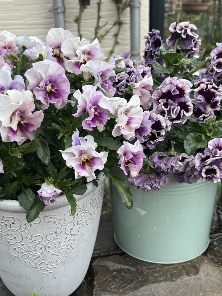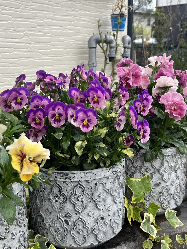 パンジービオラも鉢いっぱいに満開です