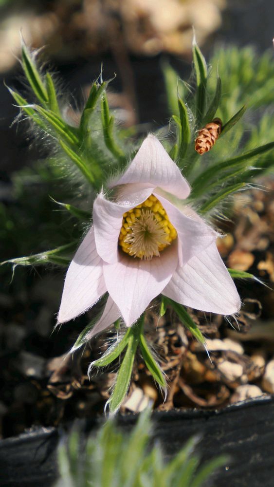 白いオキナグサ、雪国植物園で売っていました、買わなかったけど😅
