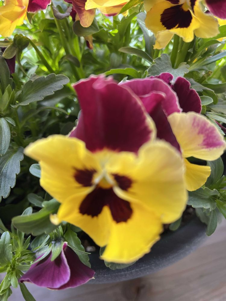 黄色と紫色のミックスのビオラです。この色の組み合わせも目立ちますねー╰(*´︶`*)╯♡