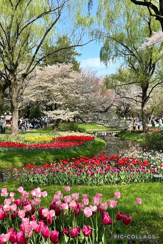 5枚目は、ご近所の友達から送られてきた昭和記念公園の写真。桜🌸とチューリップ🌷のコラボが素敵です💕