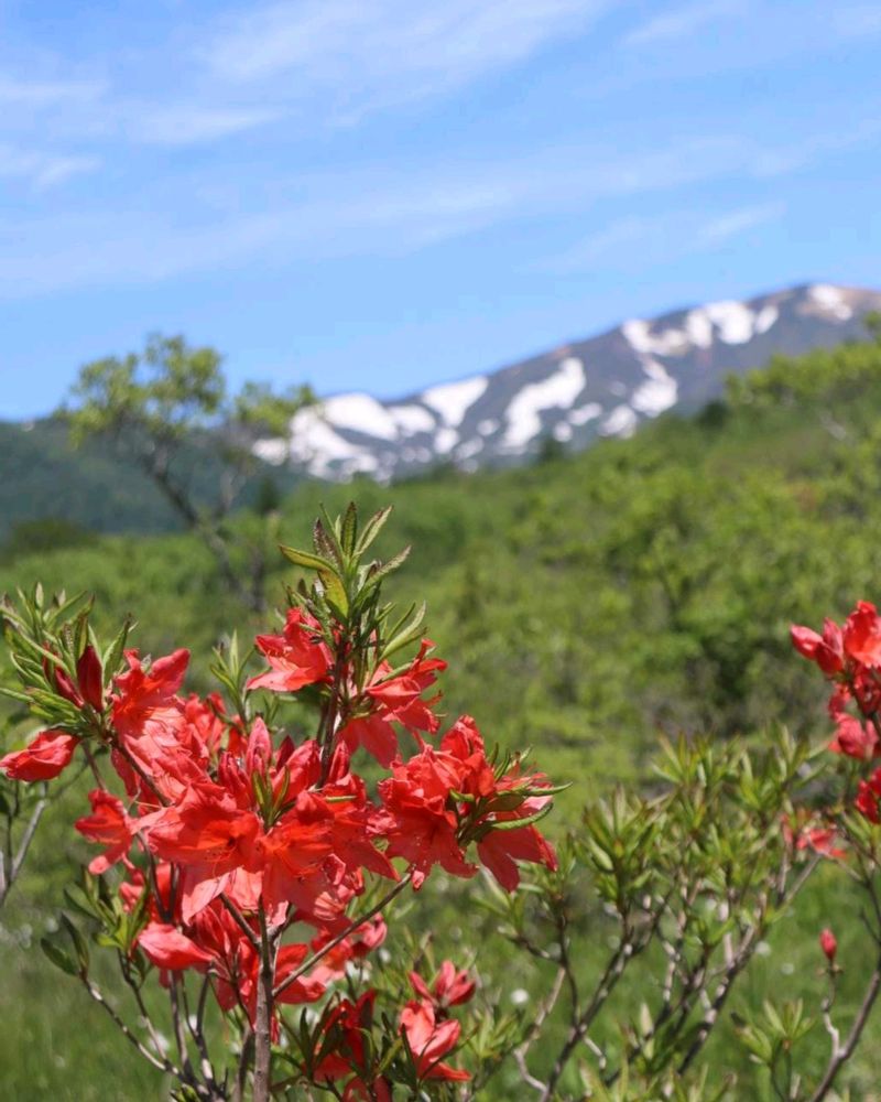 残雪の栗駒山を背景にレンゲツヅジが際立っていますね。