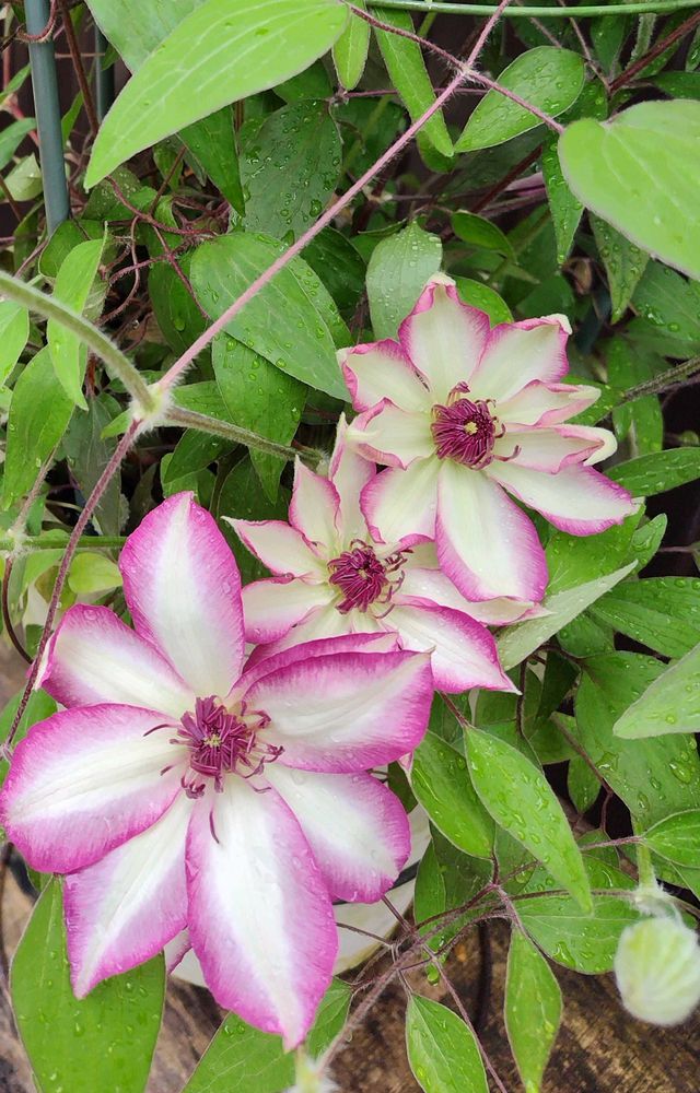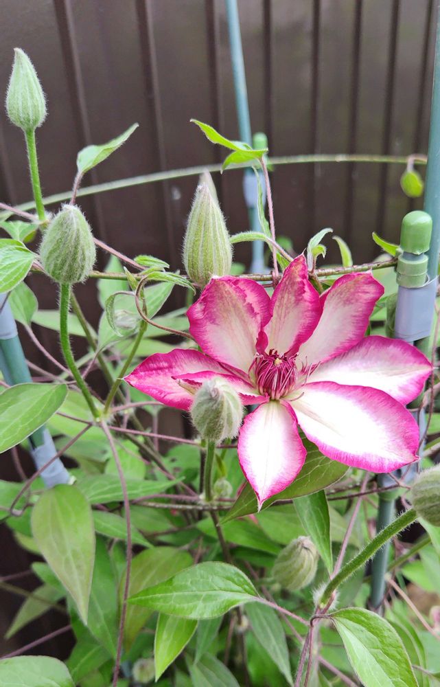 クレマチスのピコティが咲き始めました。蕾がいっぱいで鉢の上部と下部で同時に開花٩(๑❛ᴗ❛๑)۶毎年カートマニージョーの次に咲いています