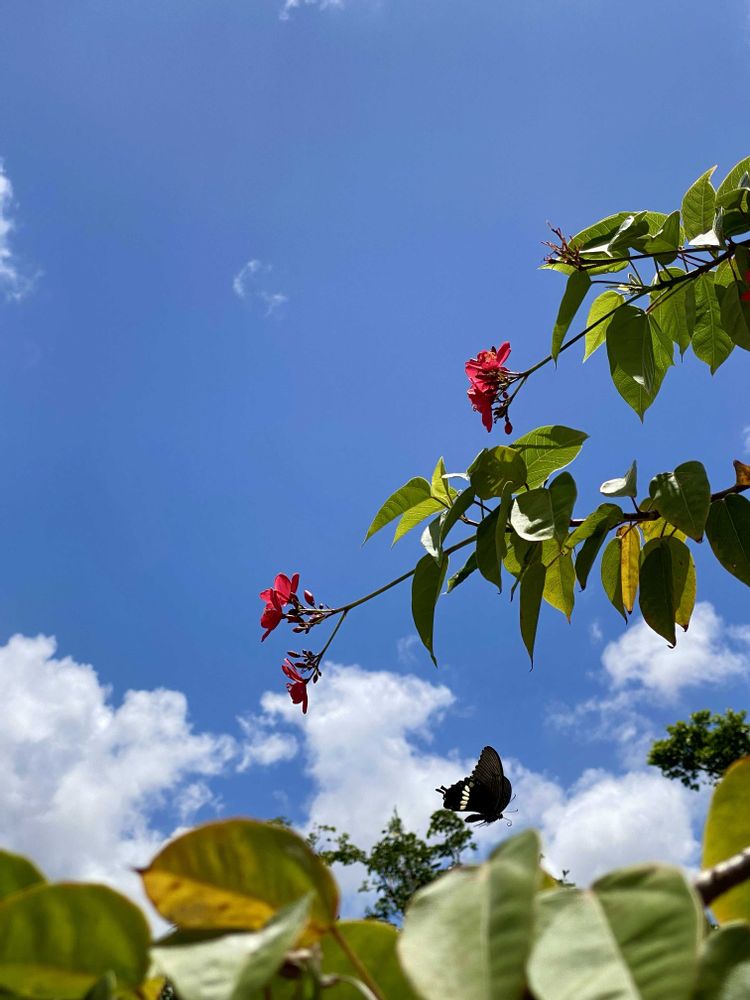 🏝️🌺何の花かわかりませんが、赤い花にたくさんのアゲハ蝶が舞っていました🦋🦋🥰